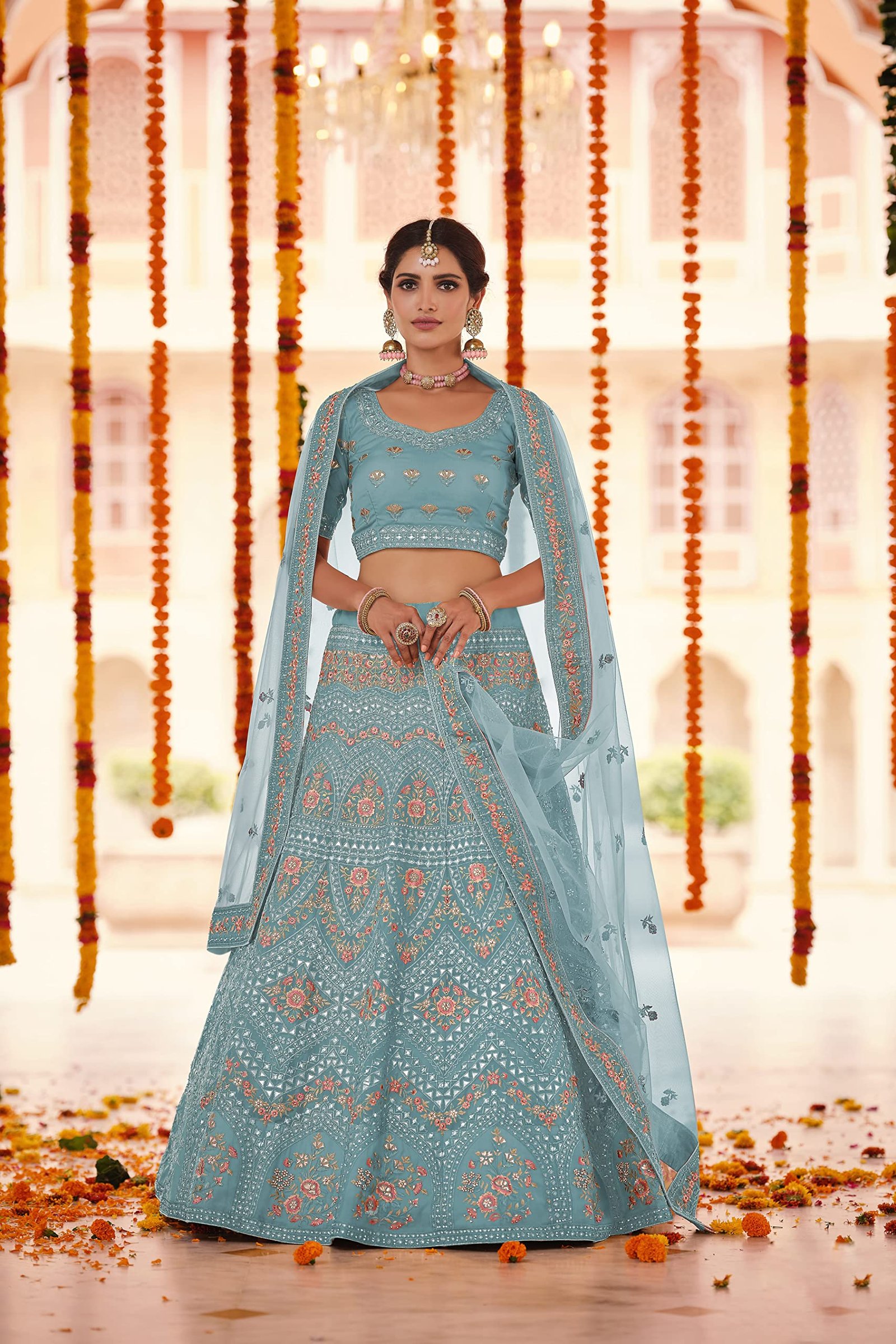 - Matching turquoise color soft net base lace border work dupatta comes with this lehenga.
