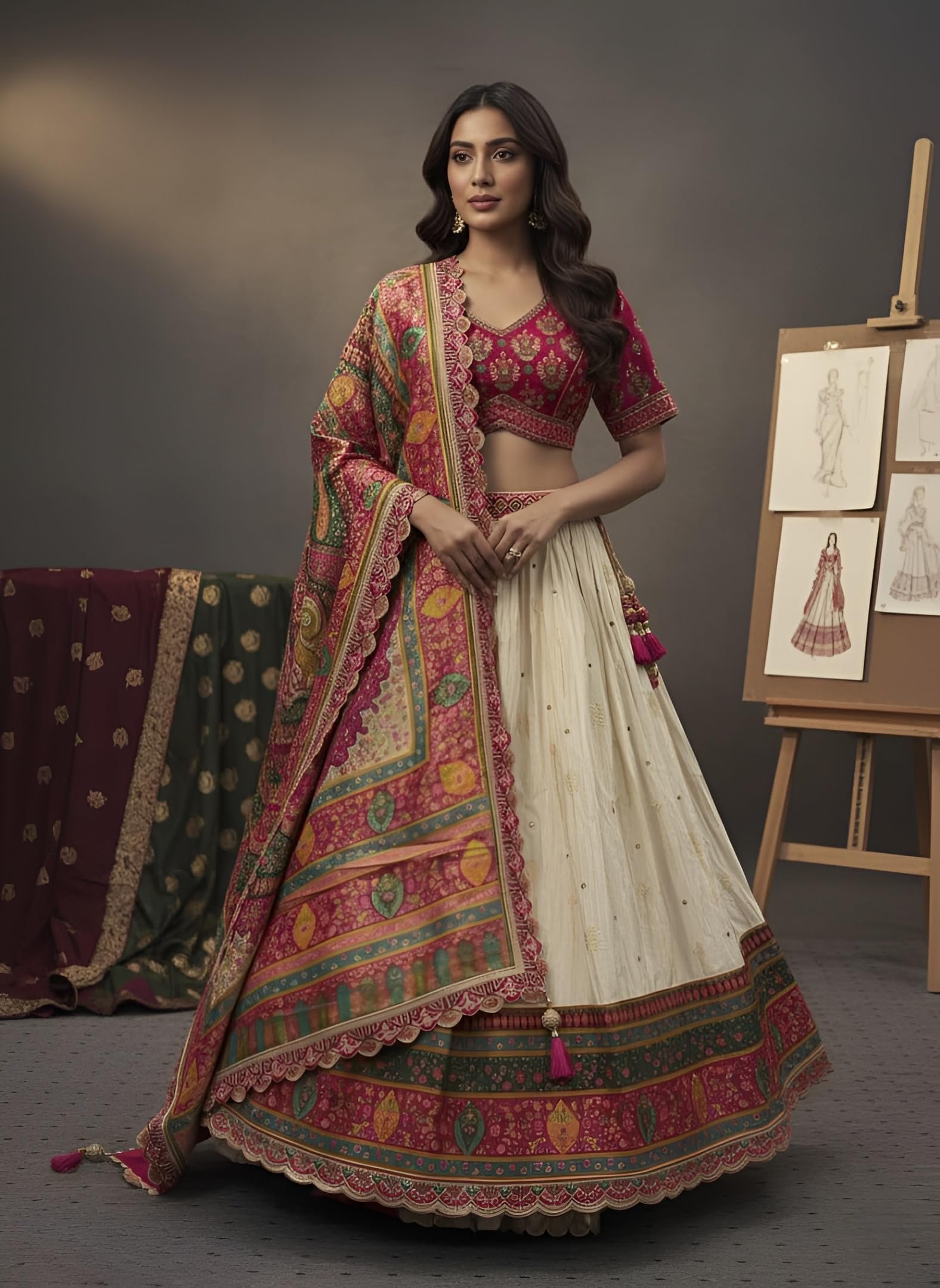 - ELEGANT DESIGN: Exquisite women’s lehenga choli set featuring a beautiful off-white skirt with vibrant magenta and multicoloured embroidered borders and intricate traditional patterns